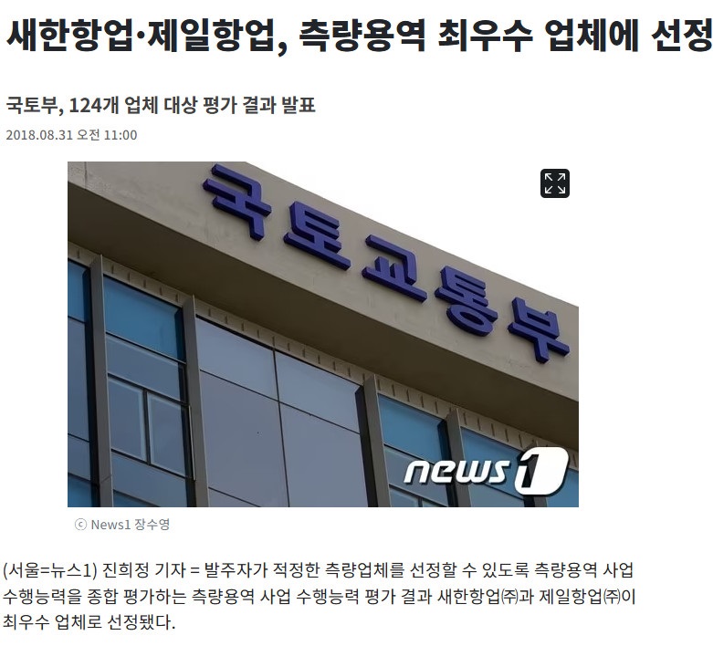 출처 : "새한항업·제일항업, 측량용역 최우수 업체에 선정" 뉴스1 : https://www.news1.kr/realestate/construction/3413634